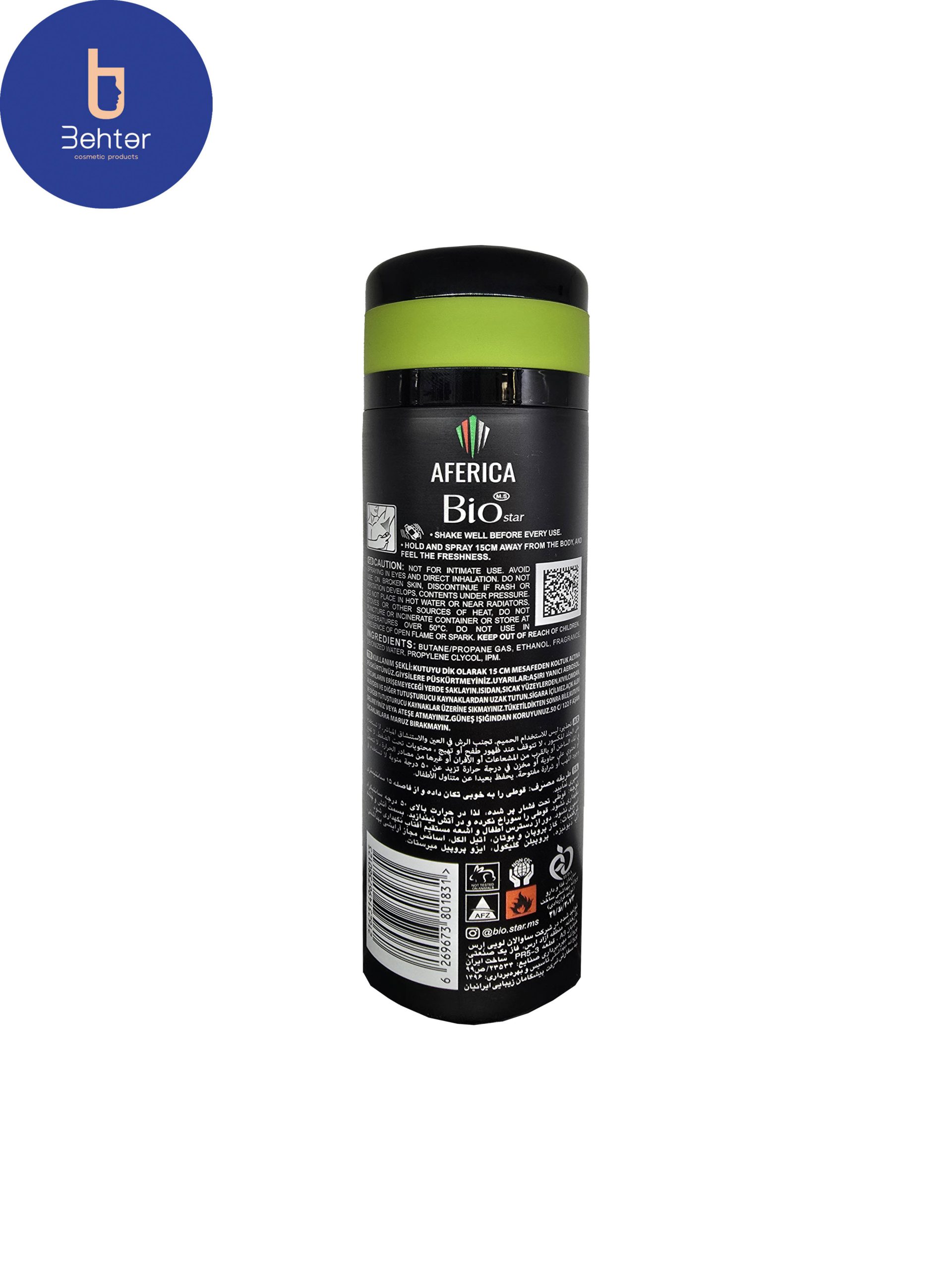 اسپری بدن بیو استار Bio star مدل آفریقا AFERICA اسپری خوشبو کننده بدن مردانه با رایحه گرم و شیرین است. این محصول با ماندگاری بالا و قدرت پخش بوی بالا برای استفاده روزانه مناسب است.این محصول با رایحه ای دلنشین و مردانه، حس اعتماد به نفس و جذابیت را در شما افزایش می دهد.